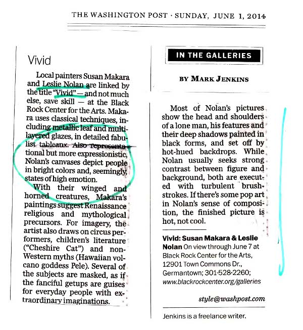 In May and June 2014 I was teamed up with fellow artist Susan Makara for “Vivid” a two-artist exhibit at BlackRock Center for the Arts in Germantown, MD. What a fabulous building with tall walls, space to breathe, and high windows. It really showed off the artwork to full advantage. Our show a fine review by Washington Post art critic Mark Jenkins.