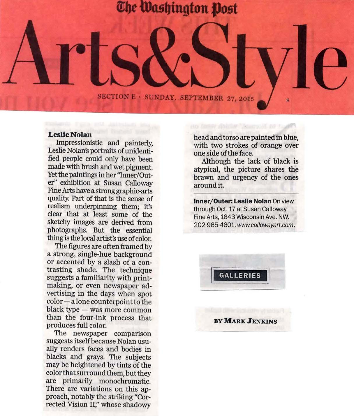 Washington Post Review of “Inner/Outer” Posted on September 29, 2015 by leslienolan2014 Nice review of my exhibit at Susan Calloway Fine Arts, Washington, DC. The exhibit remains on view until October 20 – drop by. Share this: Click to share on X (Opens in new window) X Click to share on Facebook (Opens in new window) Facebook Like Loading... Related