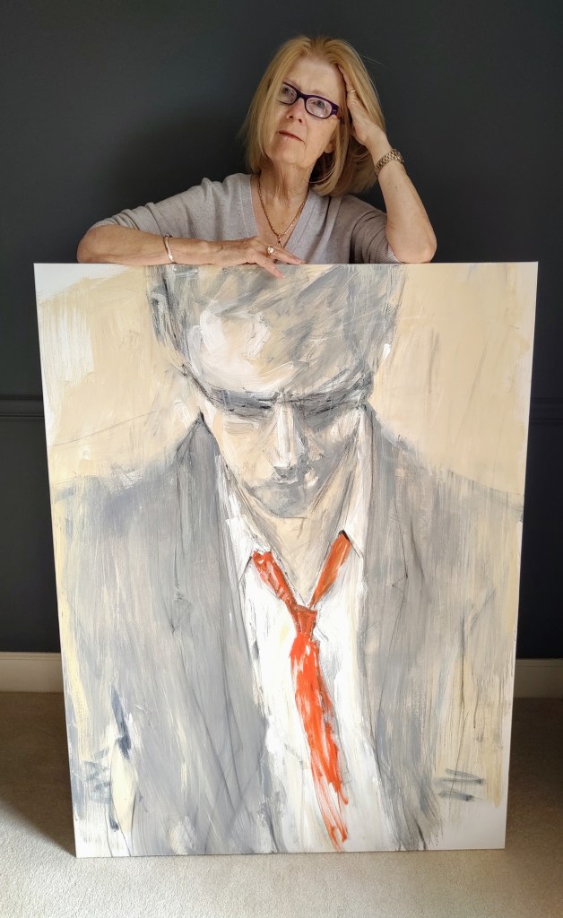 IMG_20191115_132856436.jpg Published November 18, 2019 at 2452 × 4000 in IMG_20191115_132856436.jpg Ray, 48×36 mixed media on canvas, with artist Leslie Nolan