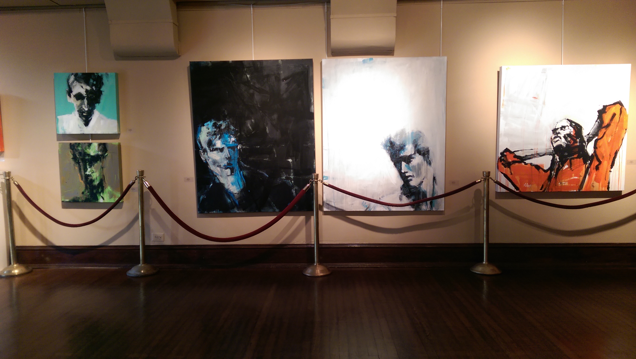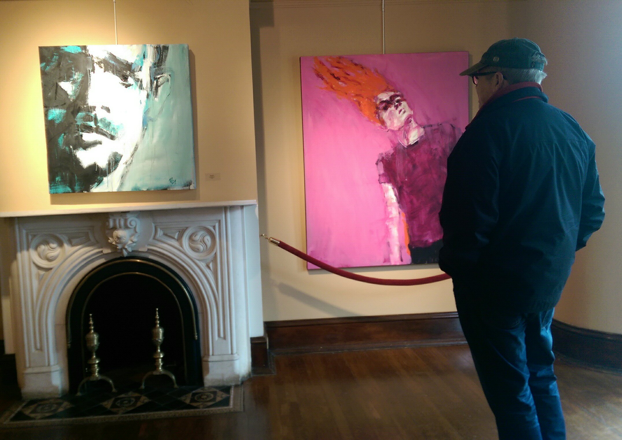 Leslie Nolan’s “Dystopian” and “Dystopian #2″ in the middle. Both 60″ high x 48” wide acrylic on canvas.